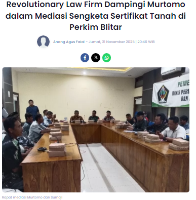 Revolutionary Law Firm resmi menjadi kuasa hukum Murtomo dalam penyelesaian sengketa terkait sertifikat tanah yang rencananya akan diterbitkan atas nama Sumaji. Pemilik sekaligus pendiri Revolutionary Law Firm, Mohammad Trijanto, SH, MH, MM, turun langsung mendampingi Murtomo dalam proses mediasi yang digelar di Dinas Perumahan dan Kawasan Permukiman (Perkim) Kabupaten Blitar, Jumat (21/11/2025).